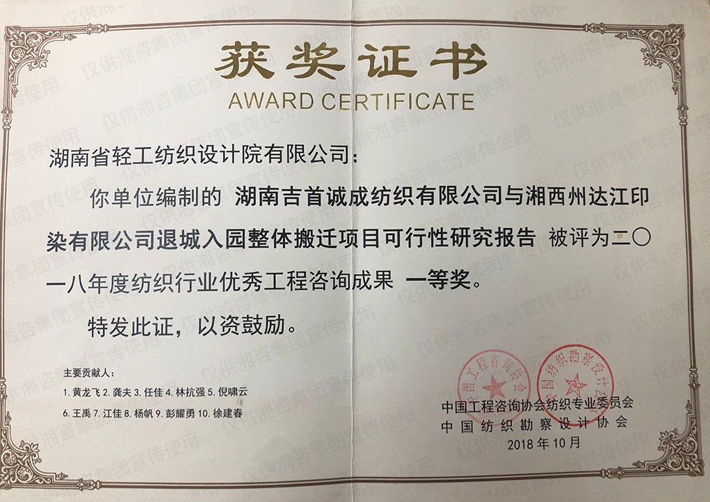 中國紡織勘察設計協會優(yōu)秀工程咨詢成果一等獎
