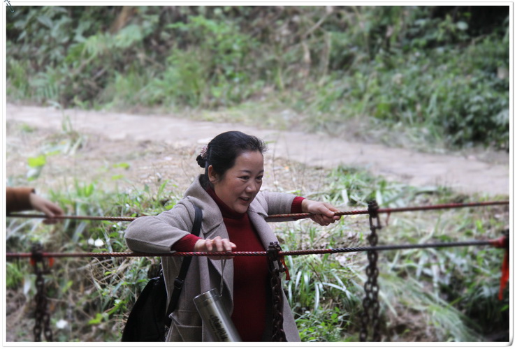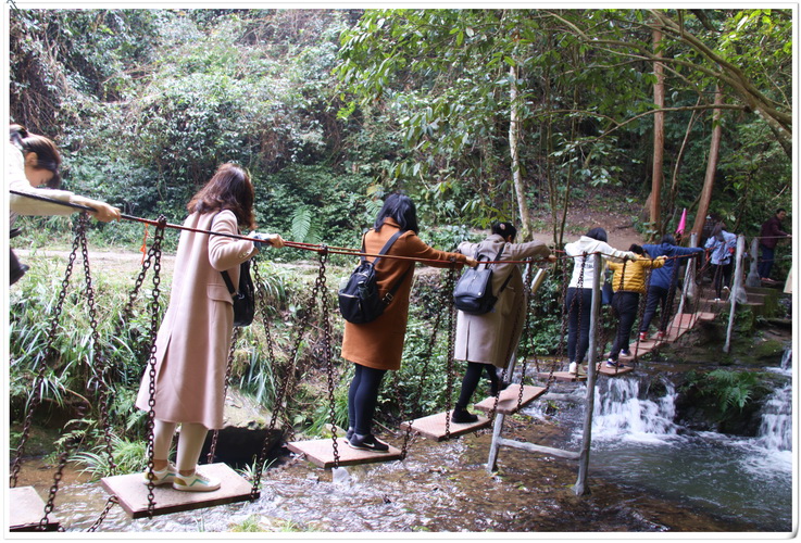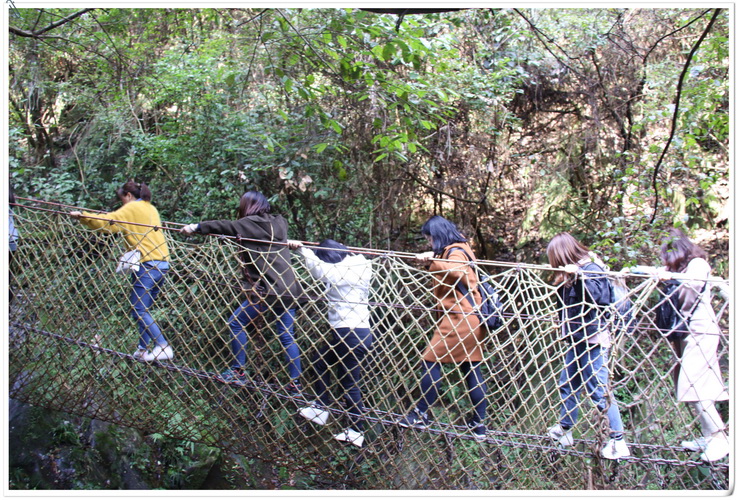 本次春游第一站為皇龍大峽谷。峽谷內(nèi),綠樹(shù)成蔭,溪水潺潺,入眼滿(mǎn)是原生態(tài)植被山林。沿著山路,景區(qū)內(nèi)精心設(shè)計(jì)的浮動(dòng)梅花樁、鐵索橋、壁虎網(wǎng)等道路并沒(méi)有困住湘咨姑娘們向上的腳步。大家不懼挑戰(zhàn)之險(xiǎn),不畏攀登之苦,努力跨越沿途障礙,收獲了諸多樂(lè)趣。