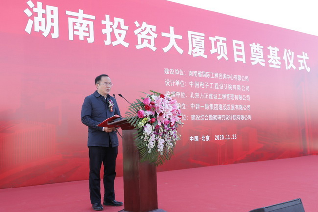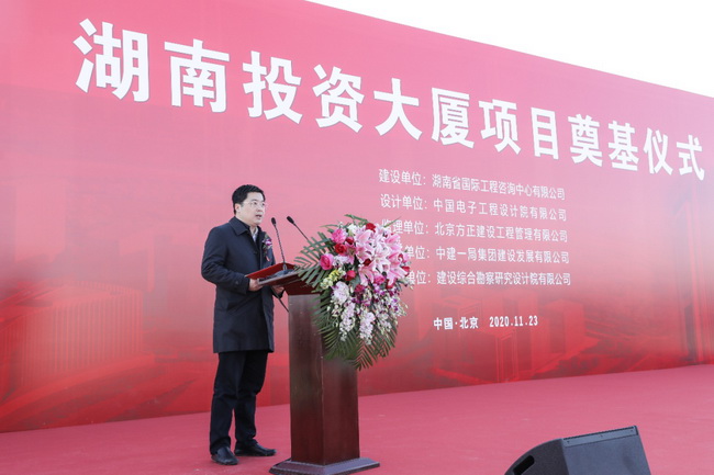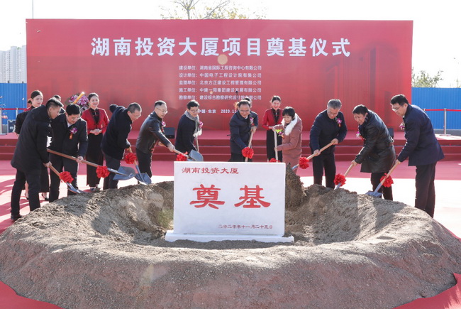 11月23日上午,(北京)湖南投資大廈項目奠基儀式在北京市豐臺區麗澤金融商務區隆重舉行。湖南省發展改革委黨組成員、湘西辦主任杜中華,湖南湘投控股集團公司黨委書記、董事長鄧軍民,黨委副書記、董事張崇政,北京麗澤金融商務區管委會副主任關芳,北京麗澤金融商務區控股公司董事長楊友強,湖南省國際工程咨詢公司黨委書記、董事長詹瓊雷,黨委副書記、總經理曹雄鷹,中建一局(集團)有限公司副總經理左強,中建一局建設發展有限公司董事長廖鋼林等近百人出席奠基儀式。儀式由張崇政副書記主持。