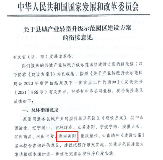 根據《國家發展改革委 科學技術部 工業和信息化部 自然資源部關于產業轉型升級示范區建設2020年度評估結果及下一步重點工作的通知》(發改振興〔2021〕866號),瀏陽經開區成功入選國家級縣城產業轉型升級示范園區。《方案》被省發展改革委、省科技廳、省工信廳和省自然資源廳聯合印發。