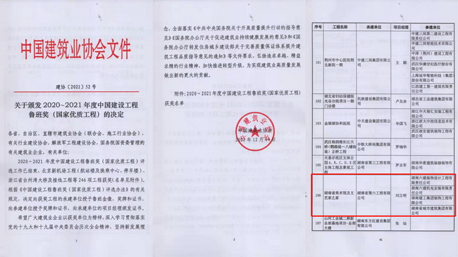近日,中國建筑業協會公布“2020~2021年度中國建設工程魯班獎(國家優質工程)獲獎工程名單”,省咨詢公司代建的湖南省美術館項目、湖南文藝家之家項目、湖南美術館展陳裝修工程三個項目成功入選。據悉,這是公司代建項目首次榮膺此項殊榮,創造了公司代建工作新的歷史。