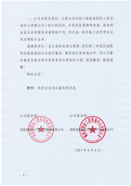 二、公司名稱變更后,以原公司名稱(湖南省國際工程咨詢中心有限公司)簽訂的合同、開具的發票繼續有效,原有的業務關系和服務承諾保持不變。即日起,我司按上述變更后信息辦理相關業務。