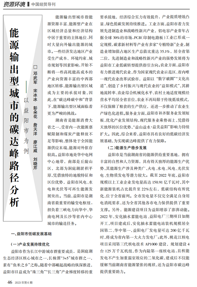 近日,由我司撰寫的《能源輸出型城市的碳達峰路徑分析—以益陽市為例》一文刊發于《中國經貿導刊》2023年第6期,作者為我司生態規劃咨詢事業部鄧武軍、彭朵花、詹天洋、廖江威。