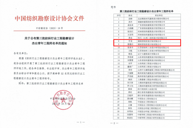近日,中國紡織勘察設計協會正式公布了“第三批紡織行業工程勘察設計杰出青年工程師”評選結果,湘咨集團下屬省輕紡院申龍、蔡德昌2名專家榮獲“第三批紡織行業勘察設計杰出青年工程師”榮譽稱號。
