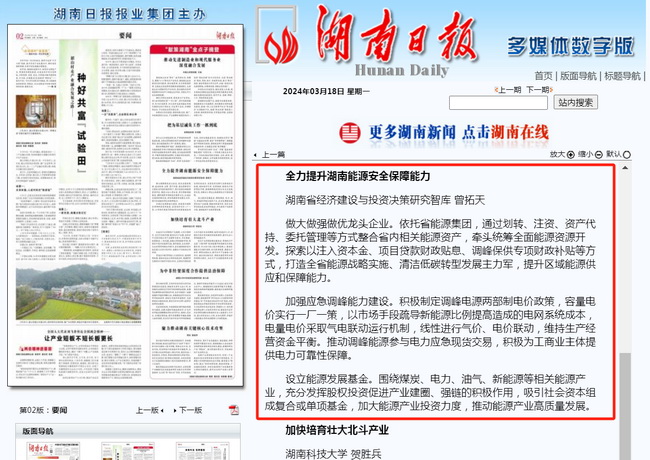 為順利實現“三高四新”美好藍圖,加快推進高質量發展,湖南省委決定在全省開展解放思想大討論活動,發起“獻策湖南”金點子征集活動。湘咨集團作為省級“智囊團”積極響應,撰寫的《全力提升湖南能源安全保障能力》于3月18日被湖南日報摘登發表。