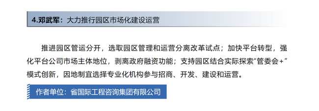 《大力推行園區市場化建設運營金點子》中建議,推進園區管運分開,選取園區管理和運營分離改革試點;加快平臺轉型,強化平臺公司市場主體地位,剝離政府融資功能;支持園區結合實際探索“管委會+”模式創新,因地制宜選擇專業化機構參與招商、開發、建設和運營。