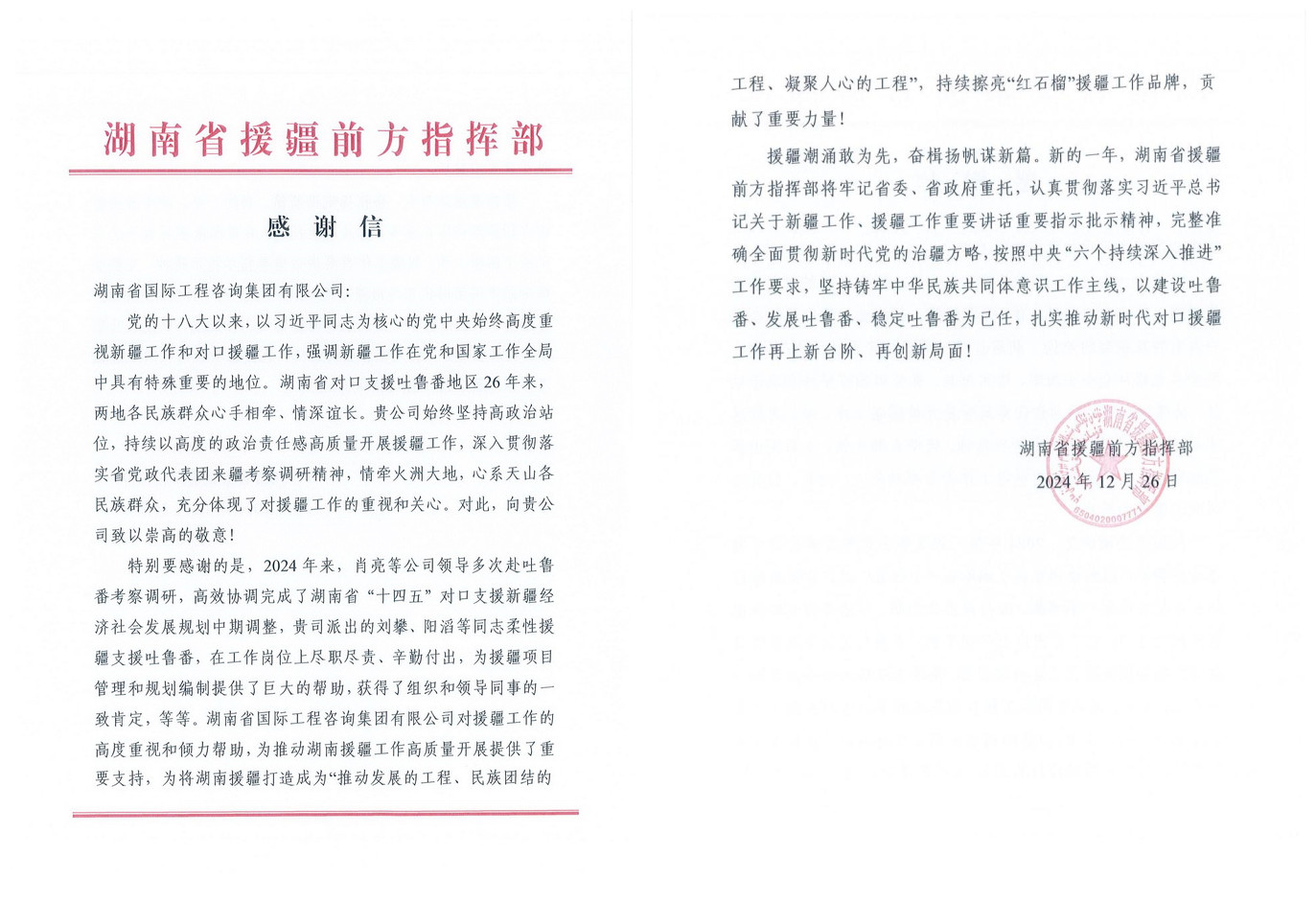 近日,湖南省援疆前方指揮部發(fā)來感謝信,對(duì)湘咨集團(tuán)及副總經(jīng)理肖亮、工作人員劉攀、陽滔等同志在援疆工作中作出的貢獻(xiàn)表示感謝。 近年來,湘咨集團(tuán)積極響應(yīng)黨中央關(guān)于援疆······